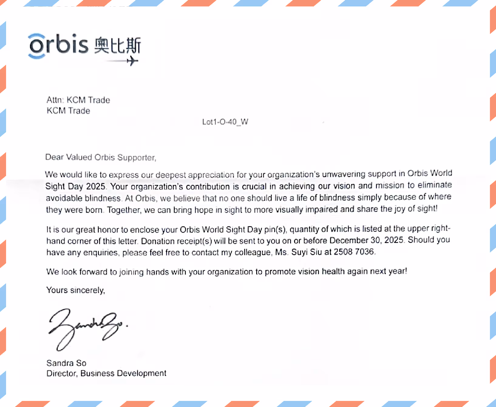 Giữ vững cam kết với trách nhiệm xã hội doanh nghiệp, KCM Trade tích cực hỗ trợ phát triển nhân tài toàn cầu, thúc đẩy giao lưu văn hóa – cộng đồng, chăm lo phúc lợi trẻ em và bảo vệ môi trường, với dấu ấn trải dài tại Hồng Kông, Úc, Thái Lan và nhiều quốc gia khác. Năm nay, Tập đoàn tự hào tham gia Ngày Thị Giác Thế Giới Orbis 2025 vào ngày 9 tháng 10 năm 2025 – sự kiện nhằm nâng cao nhận thức toàn cầu về sức khỏe mắt và phòng ngừa mù lòa có thể tránh được, đồng thời giúp các cộng đồng khó khăn tiếp cận với dịch vụ điều trị phù hợp.
