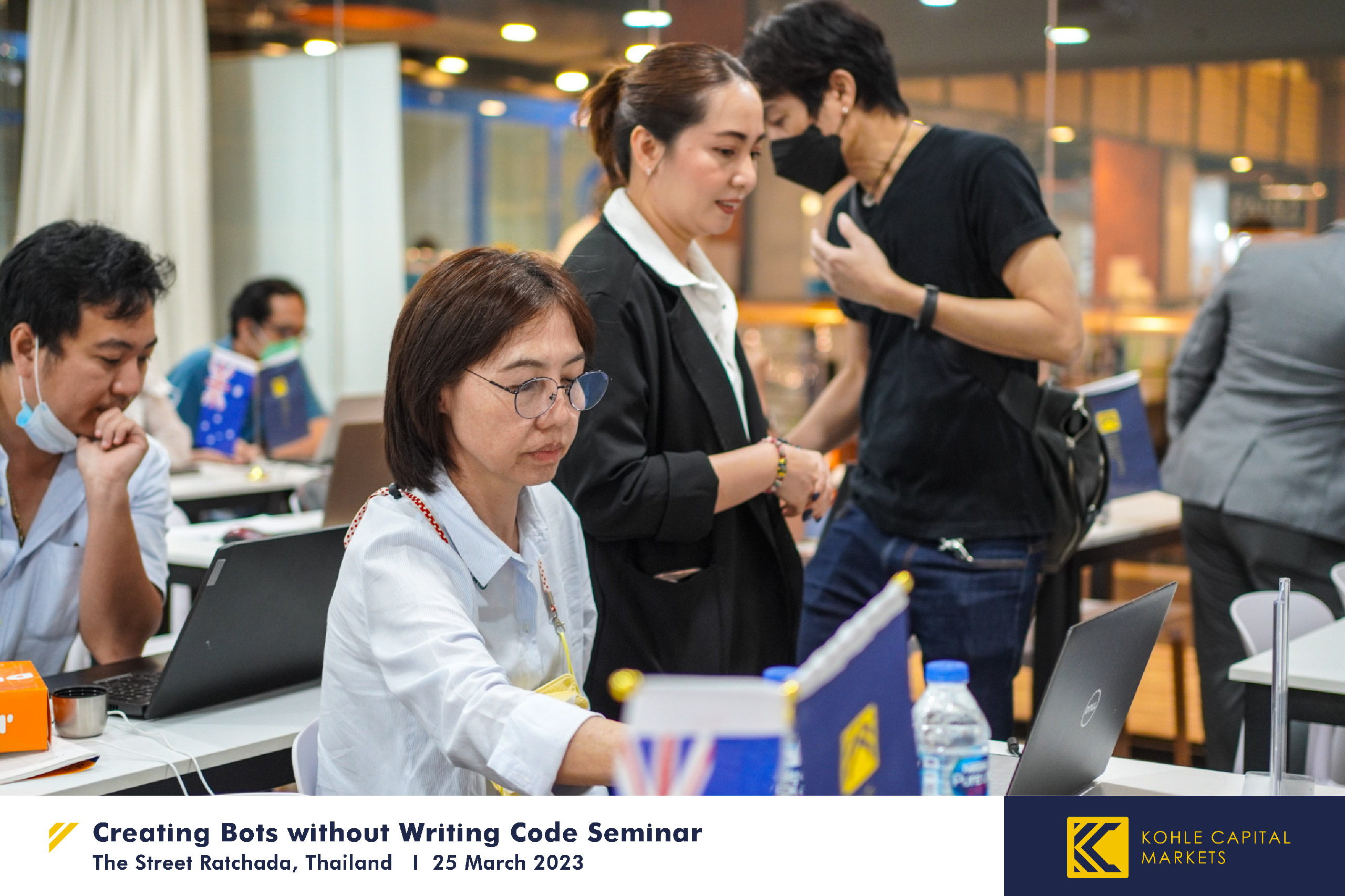 Kohle Capital Markets (KCM) đã tổ chức một hội thảo độc quyền vào ngày 25 tháng 3 năm 2023, có tên là "Tạo bot mà không cần viết mã" cho một nhóm các Nhà môi giới đầu tư của chúng tôi. Sự kiện thú vị này được tổ chức tại khu thương mại trung tâm sầm uất của Bangkok, Thái Lan. Sự kiện cung cấp cho những người tham dự một ngày đào tạo thực hành về cách xây dựng bot giao dịch tự động bằng chương trình FXdreema sáng tạo.